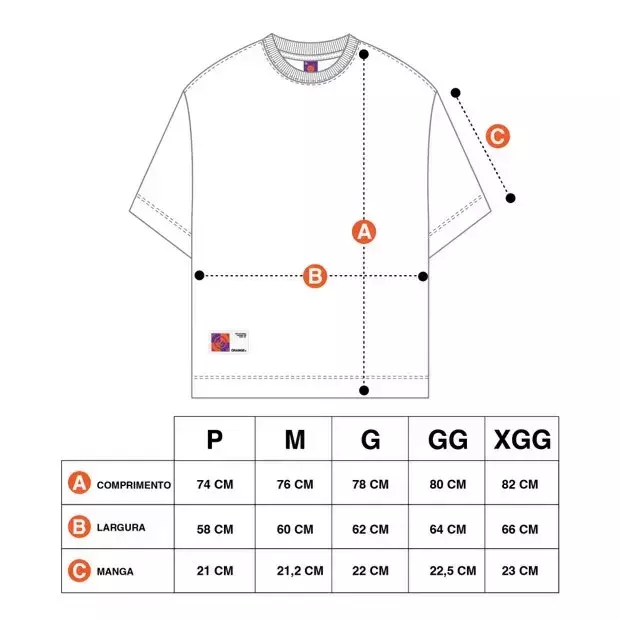 Camiseta em malha 100% algodão com gramatura alta de 180gms. Gola canelada de 2,5cm com elastano. Estampa peito em serigrafia. Etiqueta interna e externa. Acompanha adesivo ORANGE®.