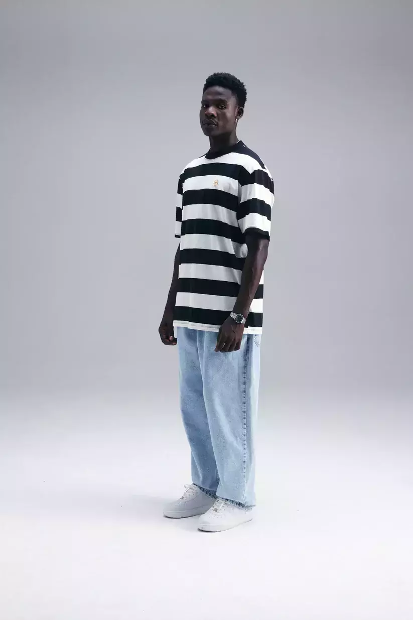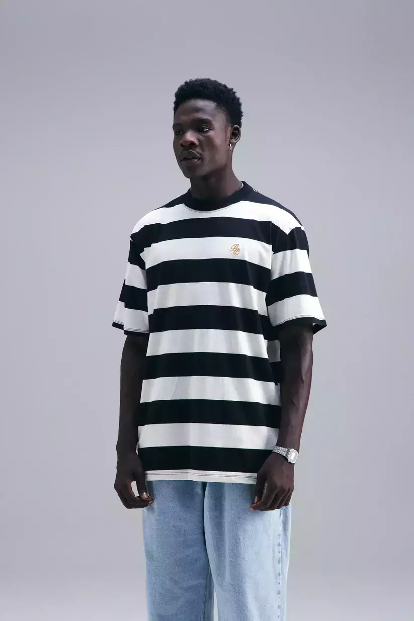 Camiseta listrada fio tinto confeccionada em malha com 97% algodão e 3% elastano, com gramatura de 180g — oferecendo conforto, elasticidade leve e visual marcante.